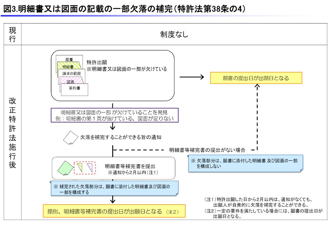 特許出願についての「明細書又は図面の記載の一部欠落の補完」に関して下記図3のように新たに規定されました。
