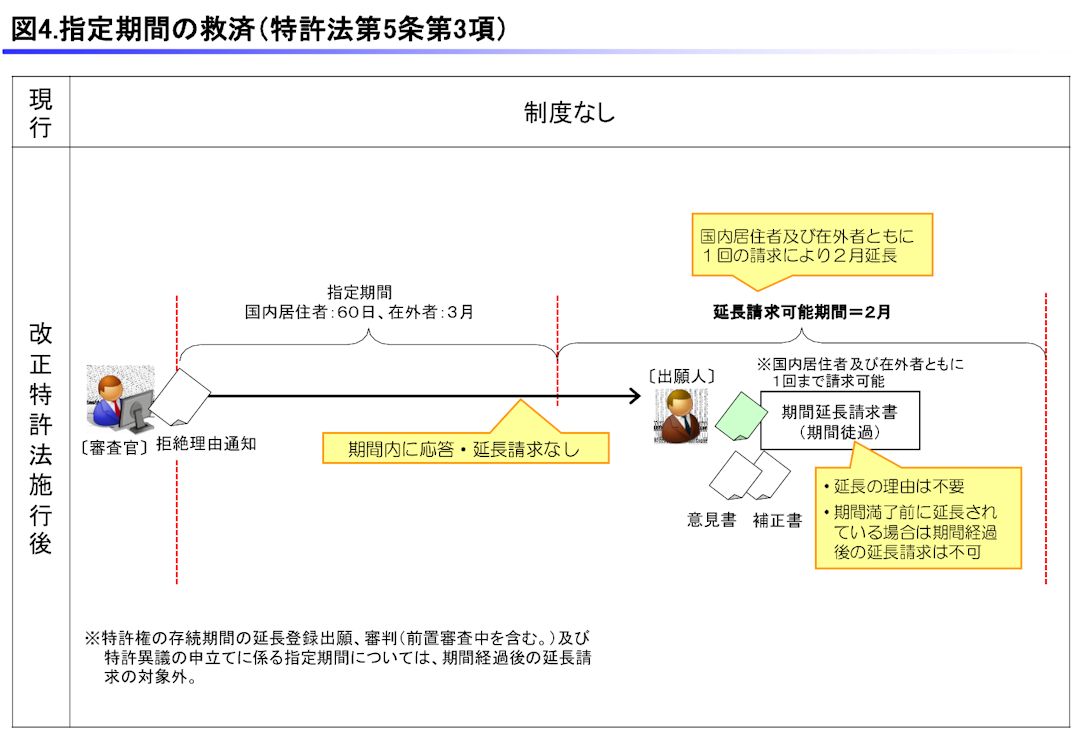 特許出願の拒絶理由通知の応答期間に関する延長に関して、下記図4の「指定期間の救済」のように新たに規定されました。