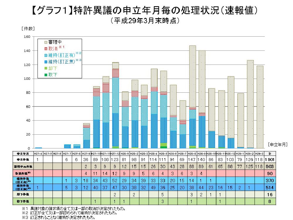 特許異議申立制度が平成27年4月に再度設けられましたが、平成29年3月末時点におけるその処理状況が特許庁より発表されました。