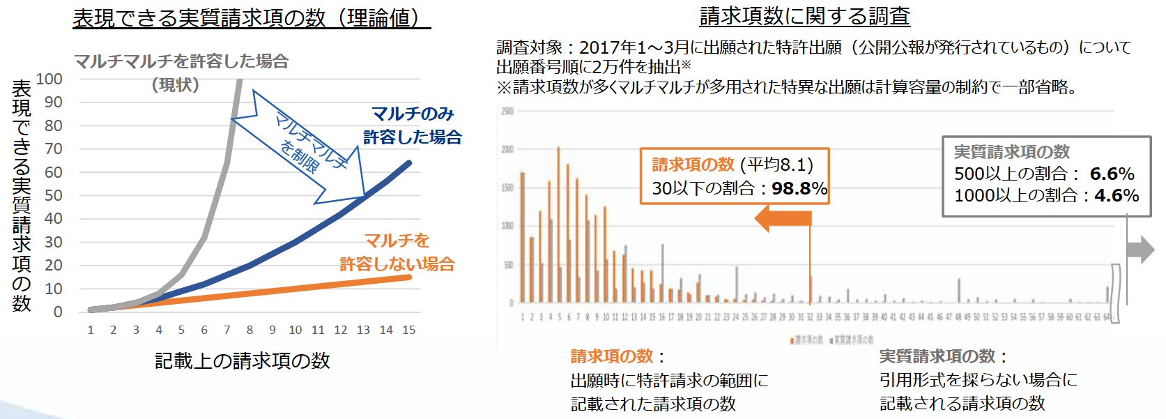マルチマルチクレームにより、下記「表現できる実質請求項の数(理論値)」のグラフのように指数関数的に増加します。例えば、請求項の数が30以下の出願が約99%を占めているにもかかわらず、実質請求項の数が1000以上になる出願が約5%も存在するのが現状です。