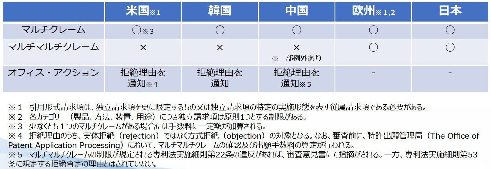 さらに、マルチマルチクレームは、下記表のように日米欧中韓の主要庁のうち、日本・欧州は認めているものの、米国・中国・韓国においては制限されており、国際調和が求められてもいました。