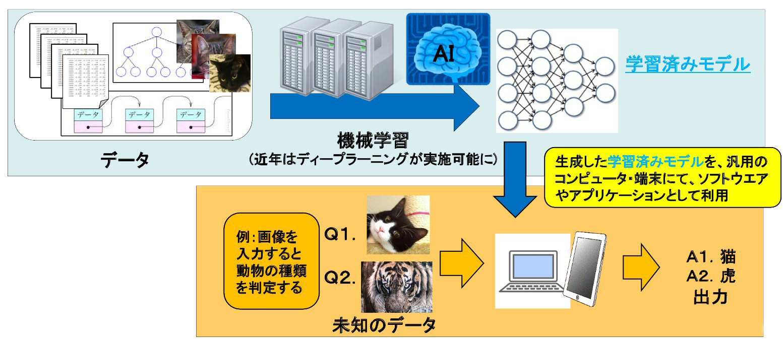 また、機械学習には様々なものがありますが、近年では、コンピュータの飛躍的な計算性能向上等により、多層構造のニューラルネットワークを用いたディープラーニング(深層学習)が下図のように実施可能ともなり、大量のデータに基づいて高品質な学習済みモデルの生成が実現されてきています。