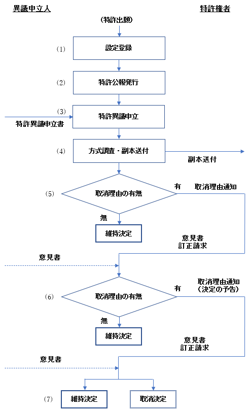 以下に特許異議申立の手続きの流れをフローチャートとともに説明いたします。
