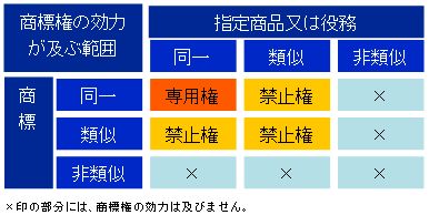 商標権者は、指定商品や指定役務について登録された商標の使用をする権利を専有する(これを「専用権」と言います)だけでなく、他人によるその類似範囲の使用を排除する(これを「禁止権」と言います)ことができます。